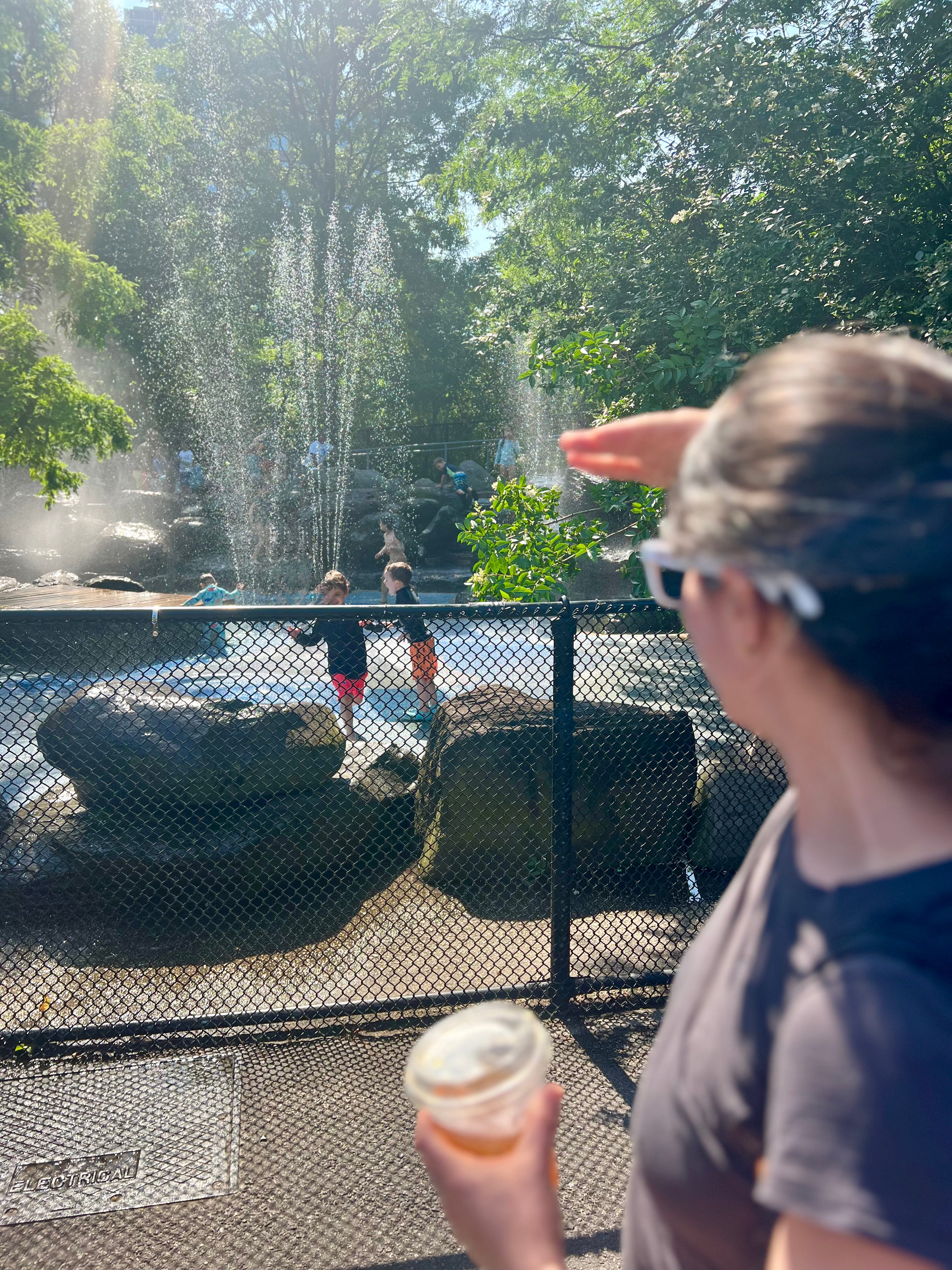 We’re at the park to say hi to Rachel’s mother—who is watching Rachel’s son and daughter—while Rachel and I are out for our walk. Rachel’s mom and I have met before, and we talk in the shade for a bit, catching up while the mist from the skyward shoots of water cools us. It’s summer in Brooklyn. One of the hottest days of the year.