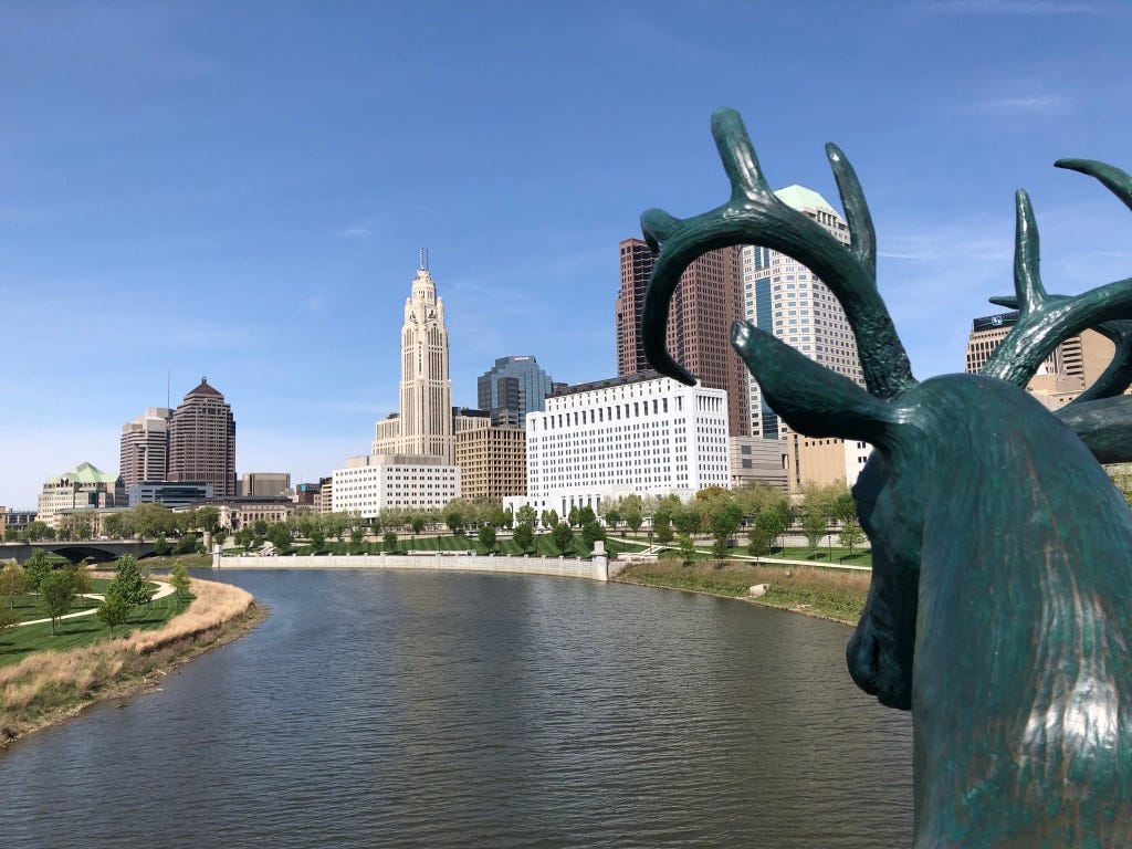 The sculpture is part of a city-commissioned art installation by artist Terry Allen, who was inspired by the name of the river itself, “Scioto,” which is derived from the Wyandot people’s word for “hairy deer.”