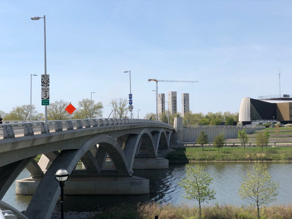 The next morning I wake up early and walk down W 2nd Avenue, which is beautiful and made of brick, all the way to the Olentangy River. I stroll along the river’s shore and follow it until it meets the Scioto, passing a family of Canadian Geese, two birds with three goslings, along the way.