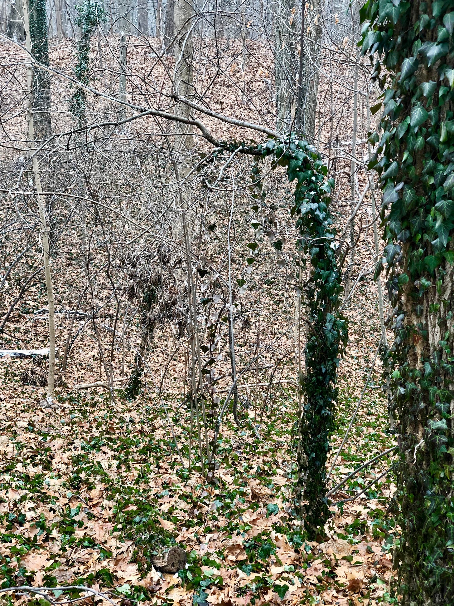 SF: Sure. Look, right over there. You see those small trees? They’re vulnerable. They’re little kid trees—can’t take care of themselves. And see all that green? That’s English ivy. The ultimate colonizer plant. All that English ivy shouldn't be there. This is pretty bad, actually. I’m going to make a note to come back later.