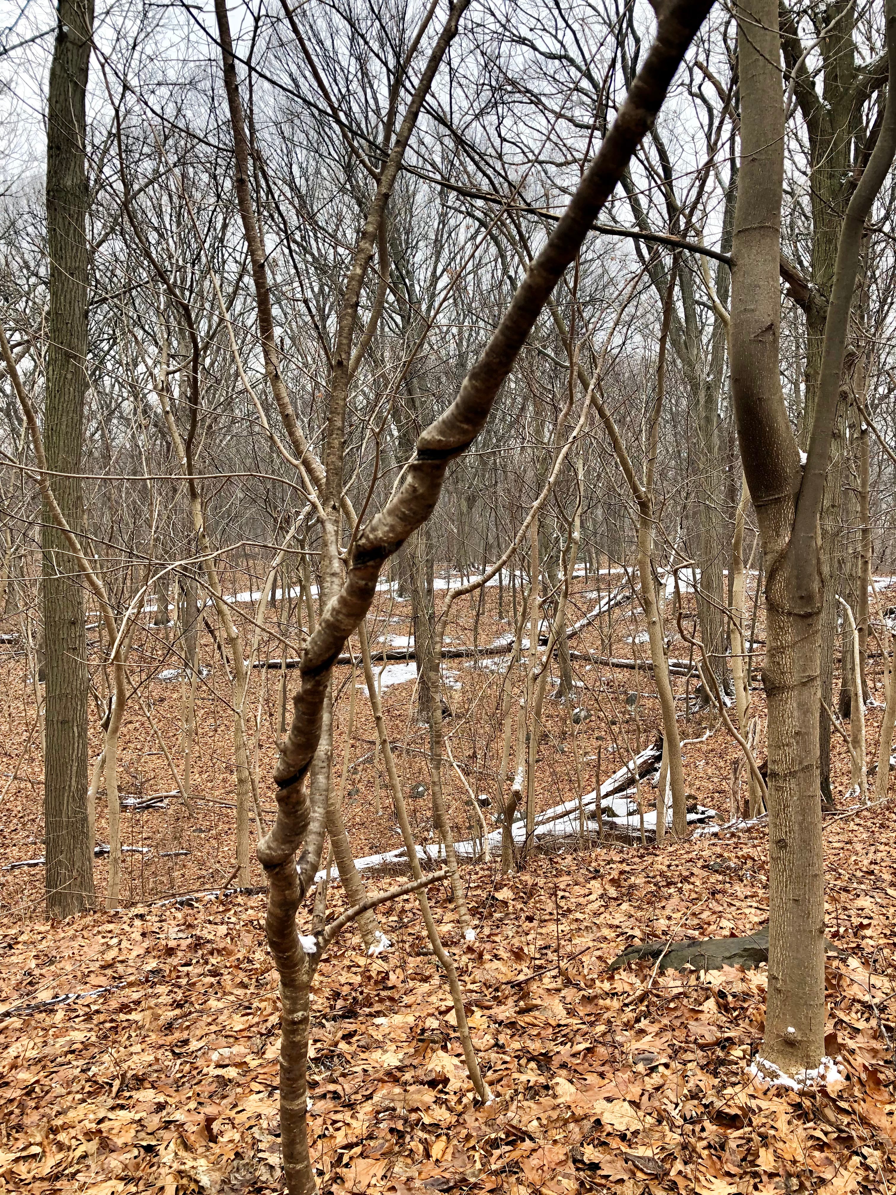 Also, here. This is Multiflora rose. Another invasive species that’s a big problem. It’s everywhere in the park—everywhere in New York City, really. Multiflora rose often works in tandem with some of these other crappy vines to take down trees. See that giant brambly thicket over there? And see that small tree? Those are all different vines taking that tree down. That tree is screwed.