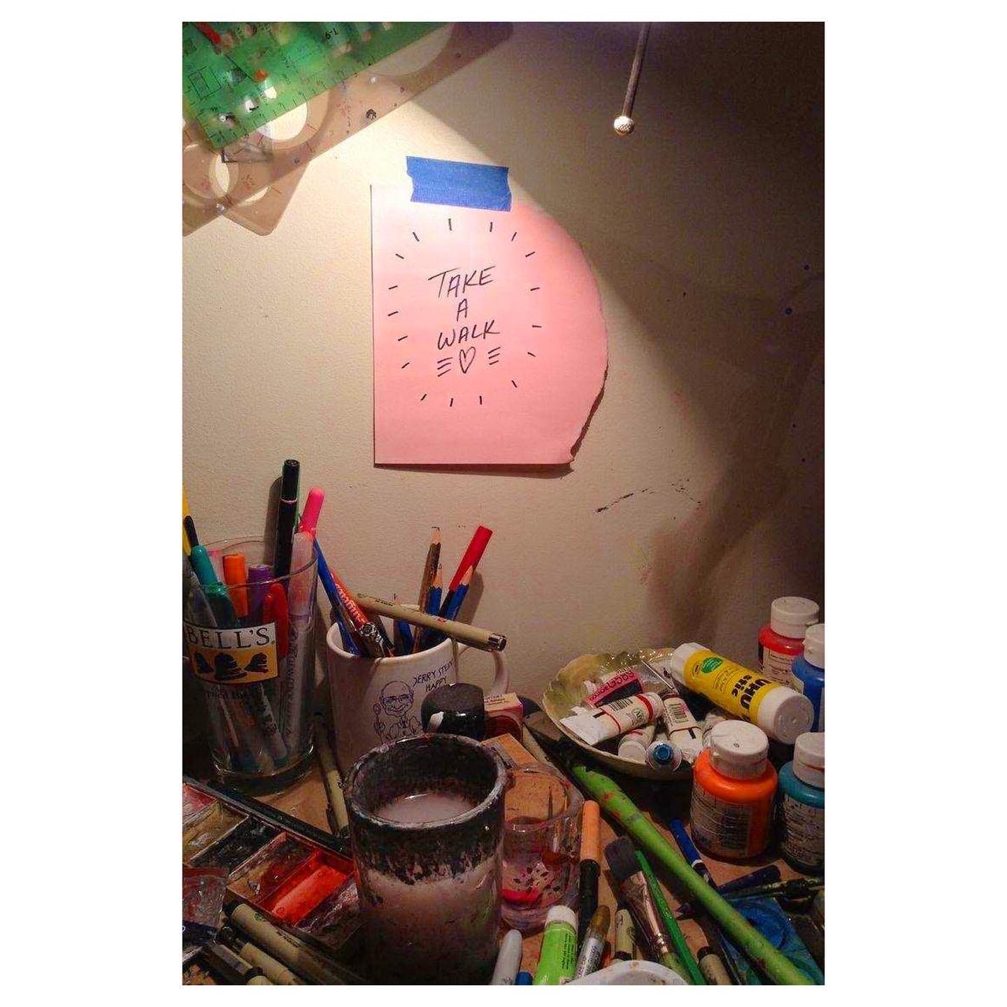 I don't need to be comfortable in my personal space, because art is about being uncomfortable, and I don't need a couch to sit on and watch TV. When I'm not drawing, I should be outside having experiences that will lend themselves to my work. So, I got rid of my couch about eight years ago. Now, during COVID I definitely was thinking, “Ok, this is silly, it’s probably time to get a couch.” But I didn't. So, my living room is basically a drawing table, a record player, my four track, my records, and my guitar.