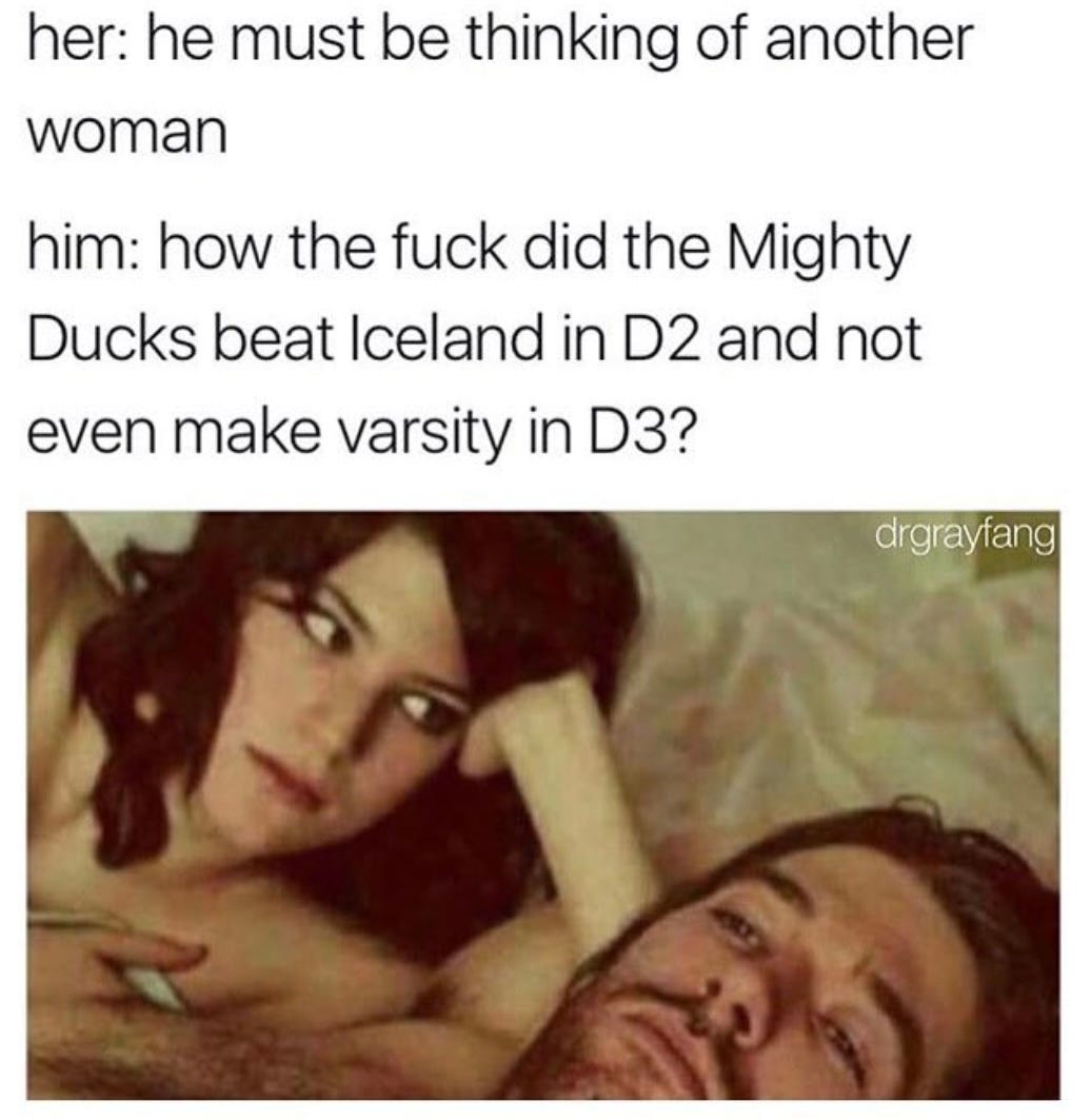 I: She’s imagining, “He’s thinking about some other woman,” but what he’s really thinking about is, “Monster trucks.”