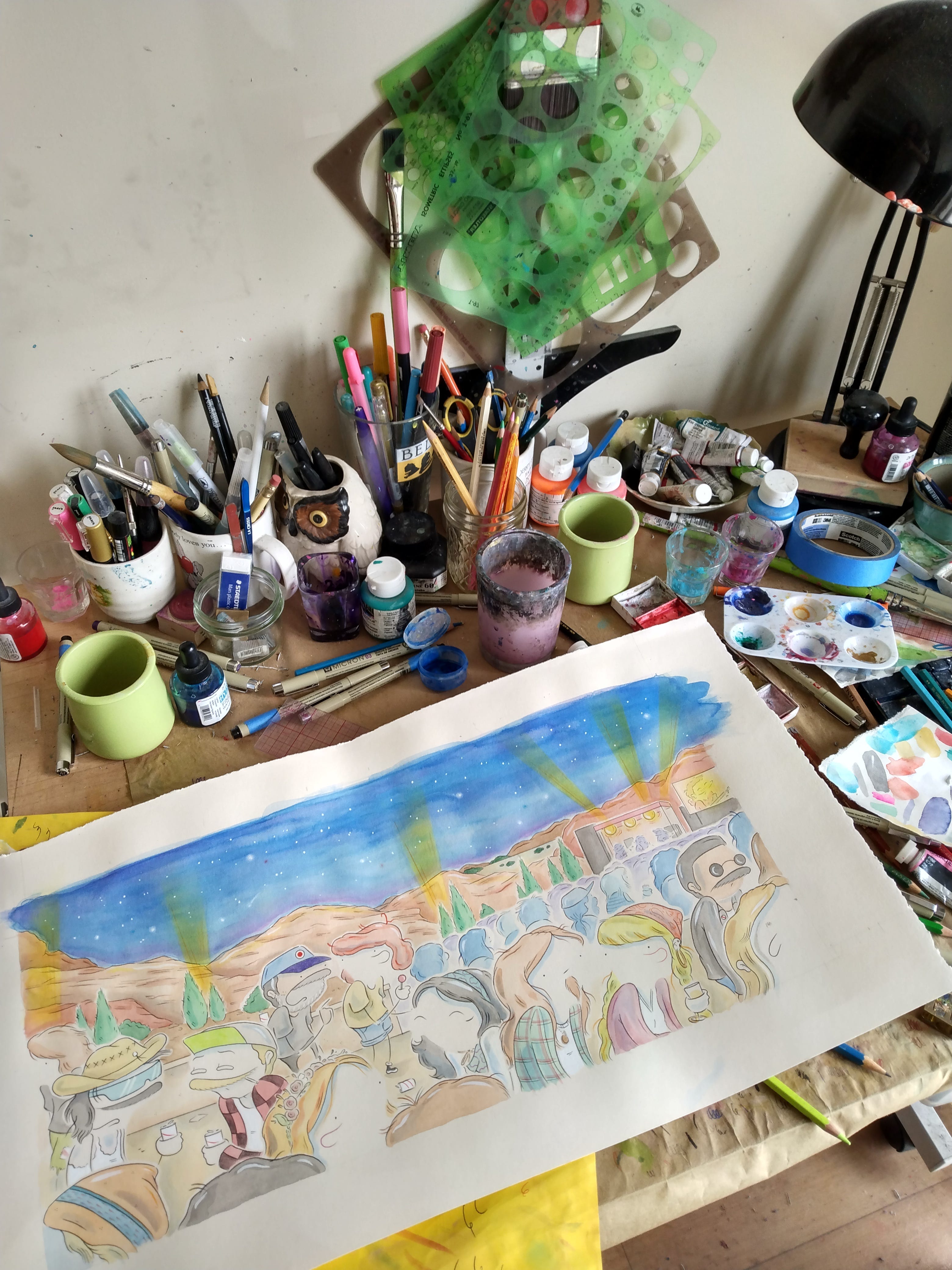 I: We’ve talked about your writing and your art and your music, but can we take a moment to simply talk about your process? One thing I admire about you is how hard you work. Which clearly started when you were a kid—drawing so intensely in kindergarten. Am I right in saying, you don’t have a couch?