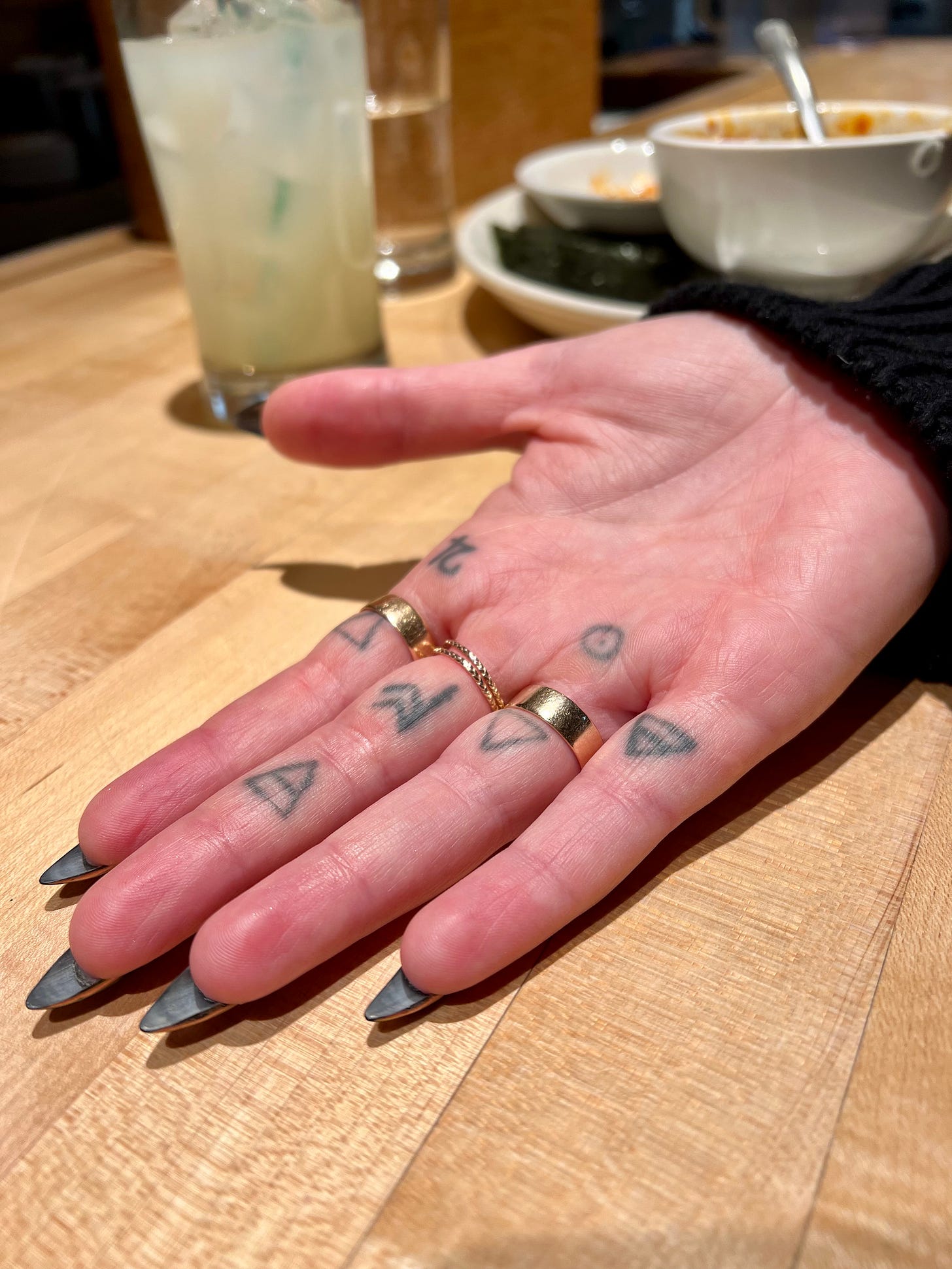 Something I’ve always loved about you—and, at certain times throughout us knowing each other, something I’ve been intimidated by—are your hand tattoos. Not just on your fingers, but tattoos on the palms of your hands. Can you tell me about them?