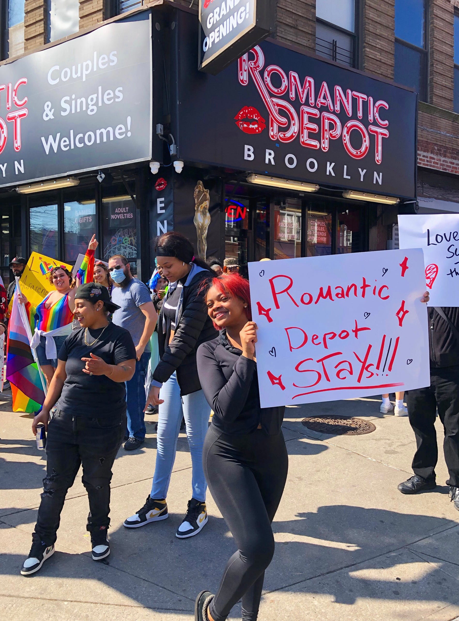 A woman holding a placard that reads “Romantic Depot Stays” is shouting at me as I walk down Washington Avenue. She is standing in front of a storefront, under a more permanent sign—“Romantic Depot: Grand Opening!”—and is surrounded by a crowd of people waving rainbow flags and cheering. When it comes to sex shops, I consider myself for ‘em. So I pump my fist in the air. The cheering grows louder.