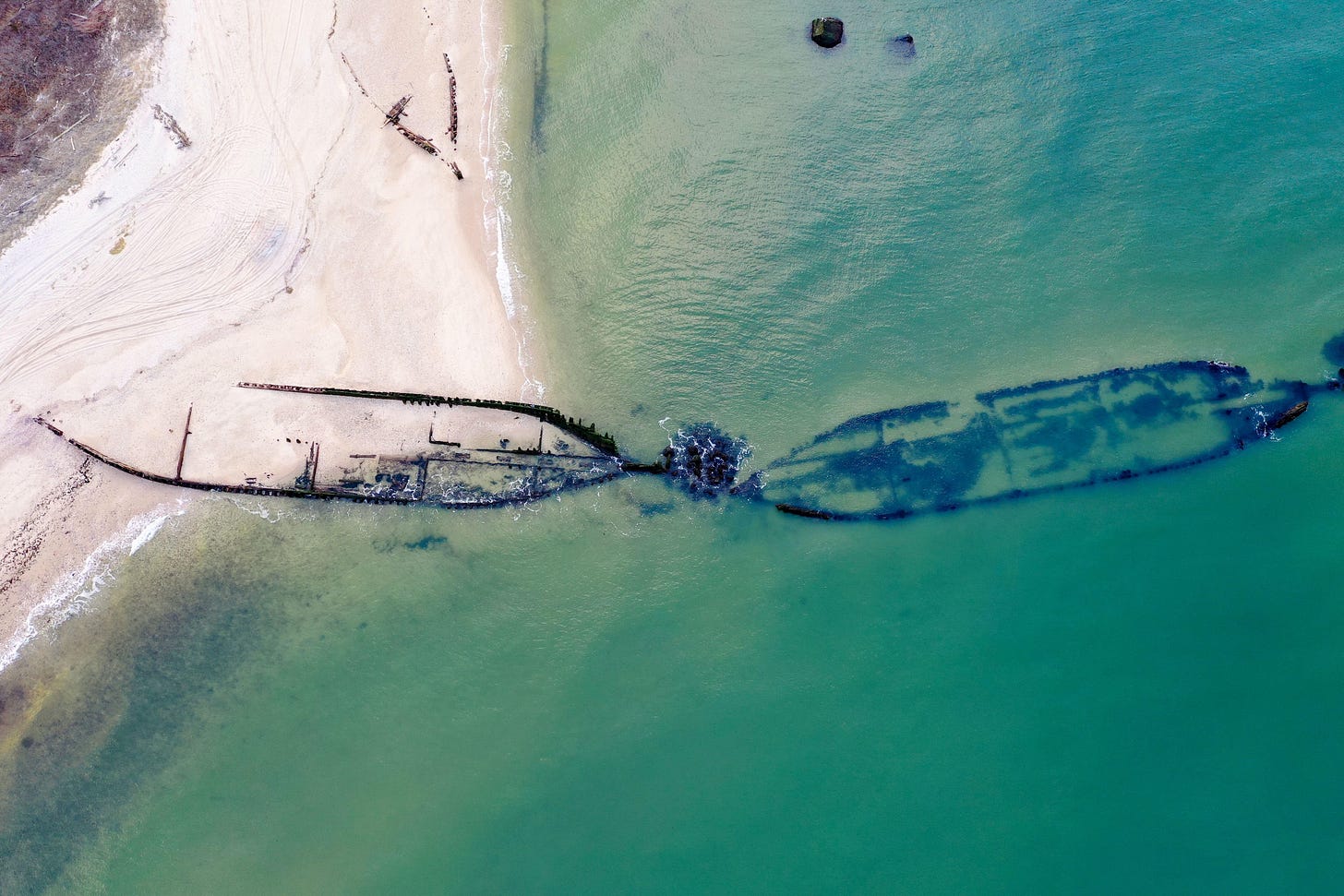 [Editor’s Note: While researching the shipwrecks, I came across this stunning aerial photo of three of the wrecks. I’ve paid the $19.99 licensing fee so I can share said photo with you. Please consider a paid subscription to Walk It Off so that I can continue to pay for things like licensing fees and, you know, more cherry cream pies.]
