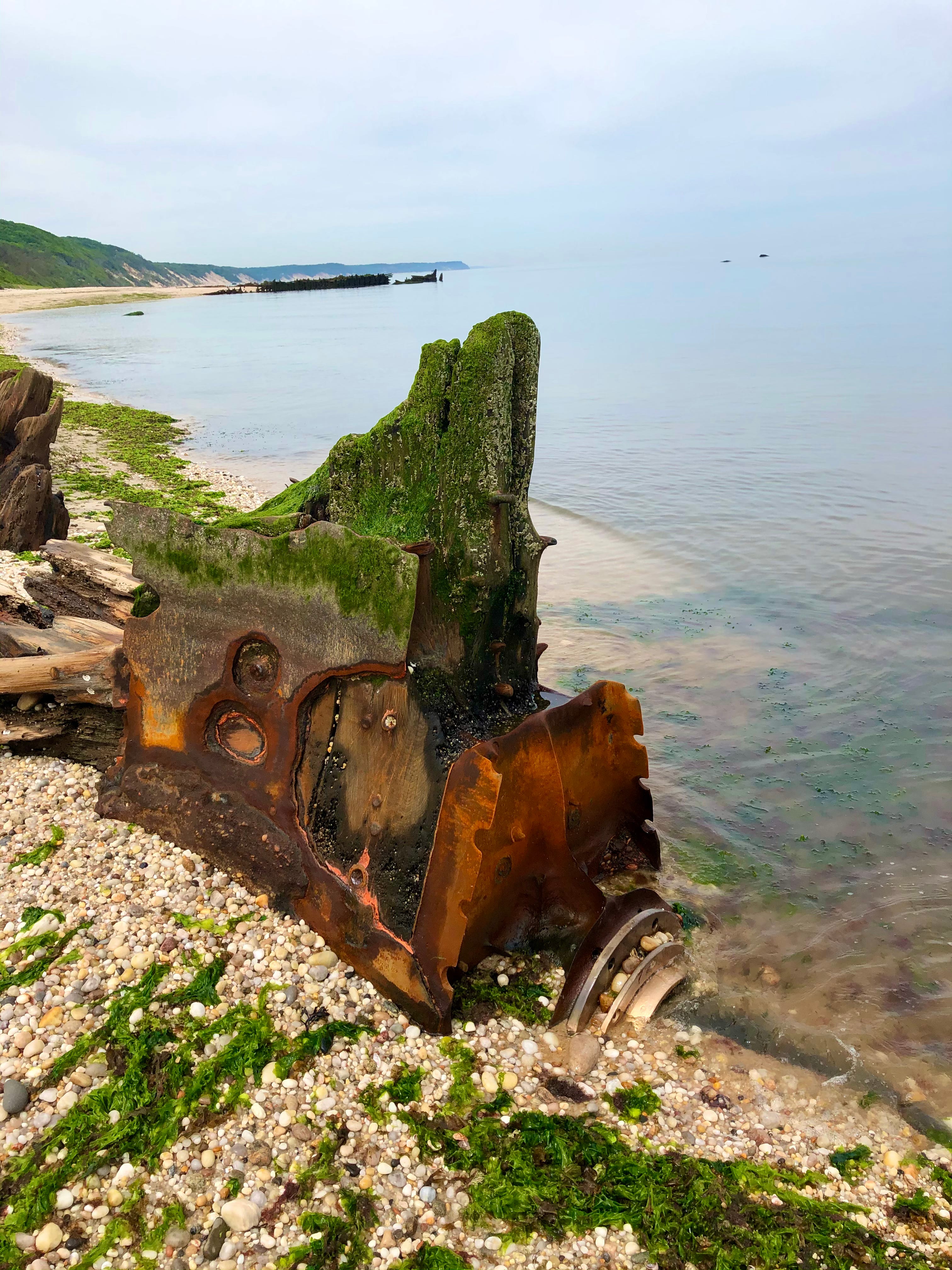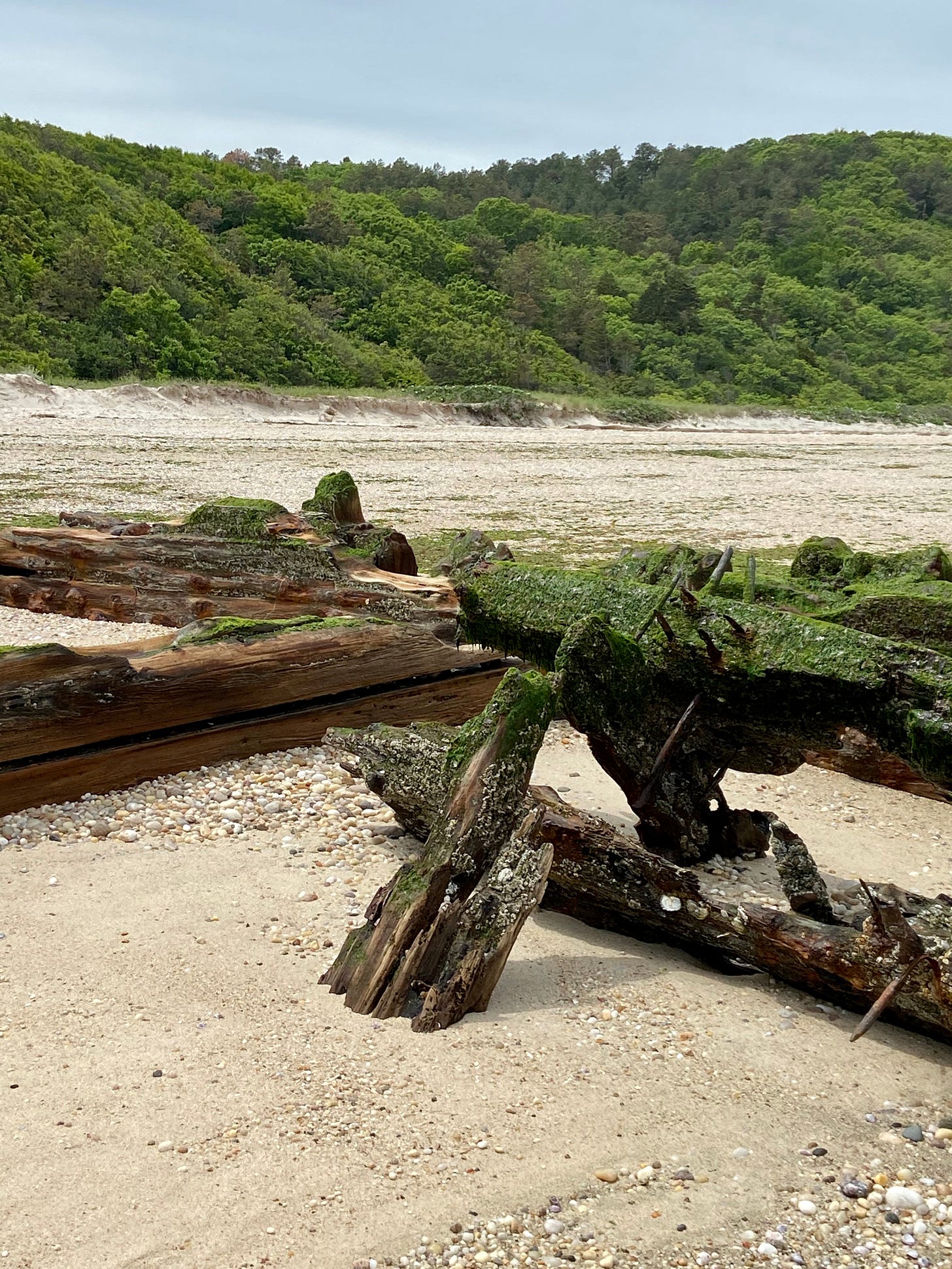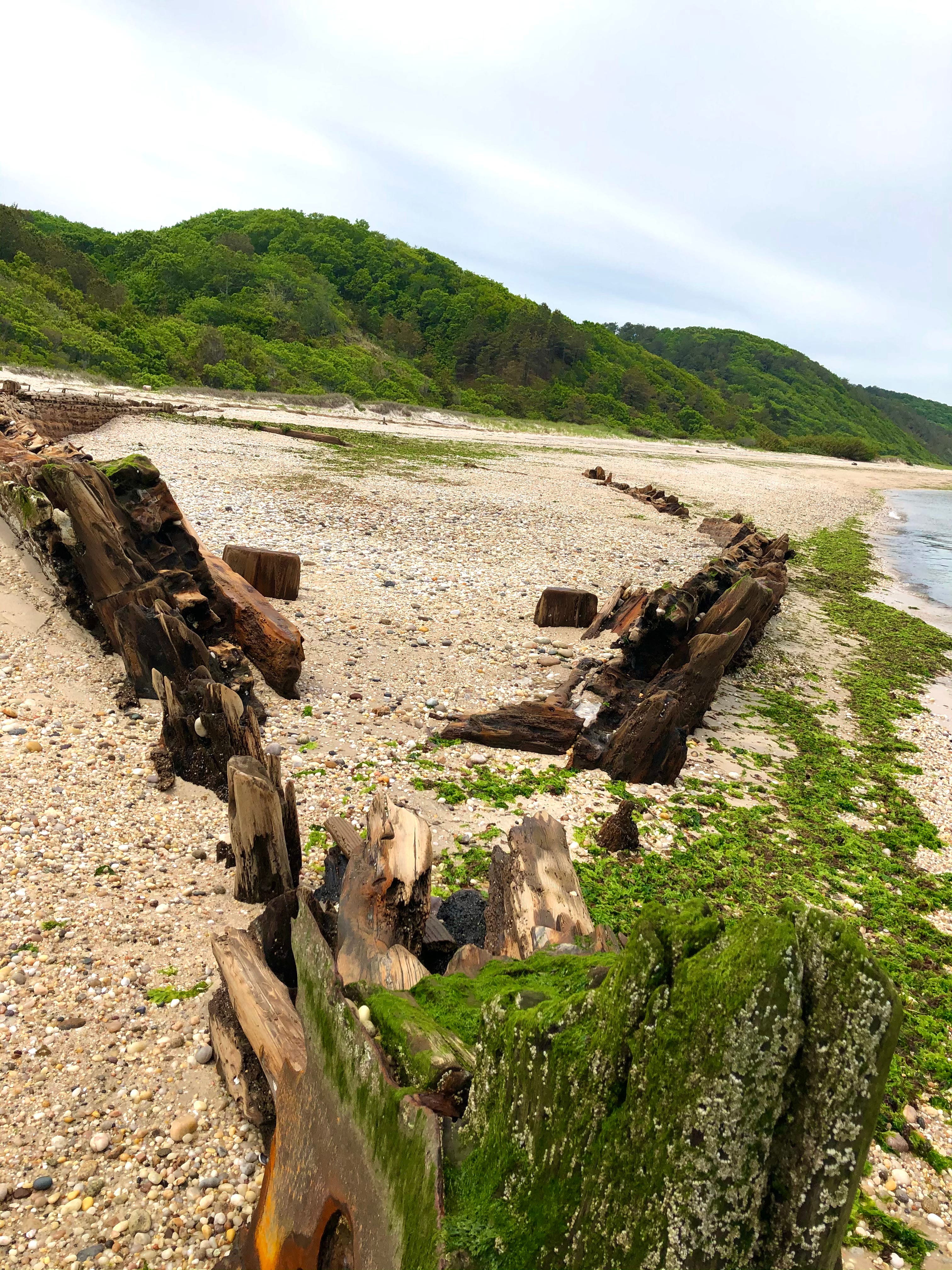 The wreck comes more fully into view. It is hulking and magnificent, made of wood and iron and covered in sea moss. Out in the water, past the first shipwreck, sticking out of the sound, is a second shipwreck. As I come around a bend in the beach a third and fourth wreck come into view.