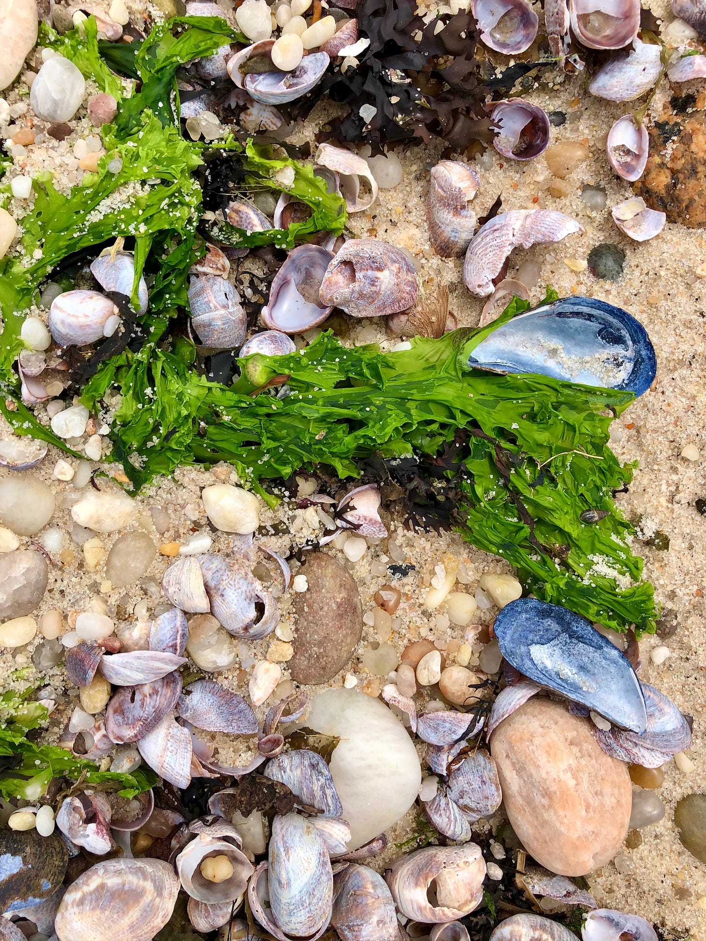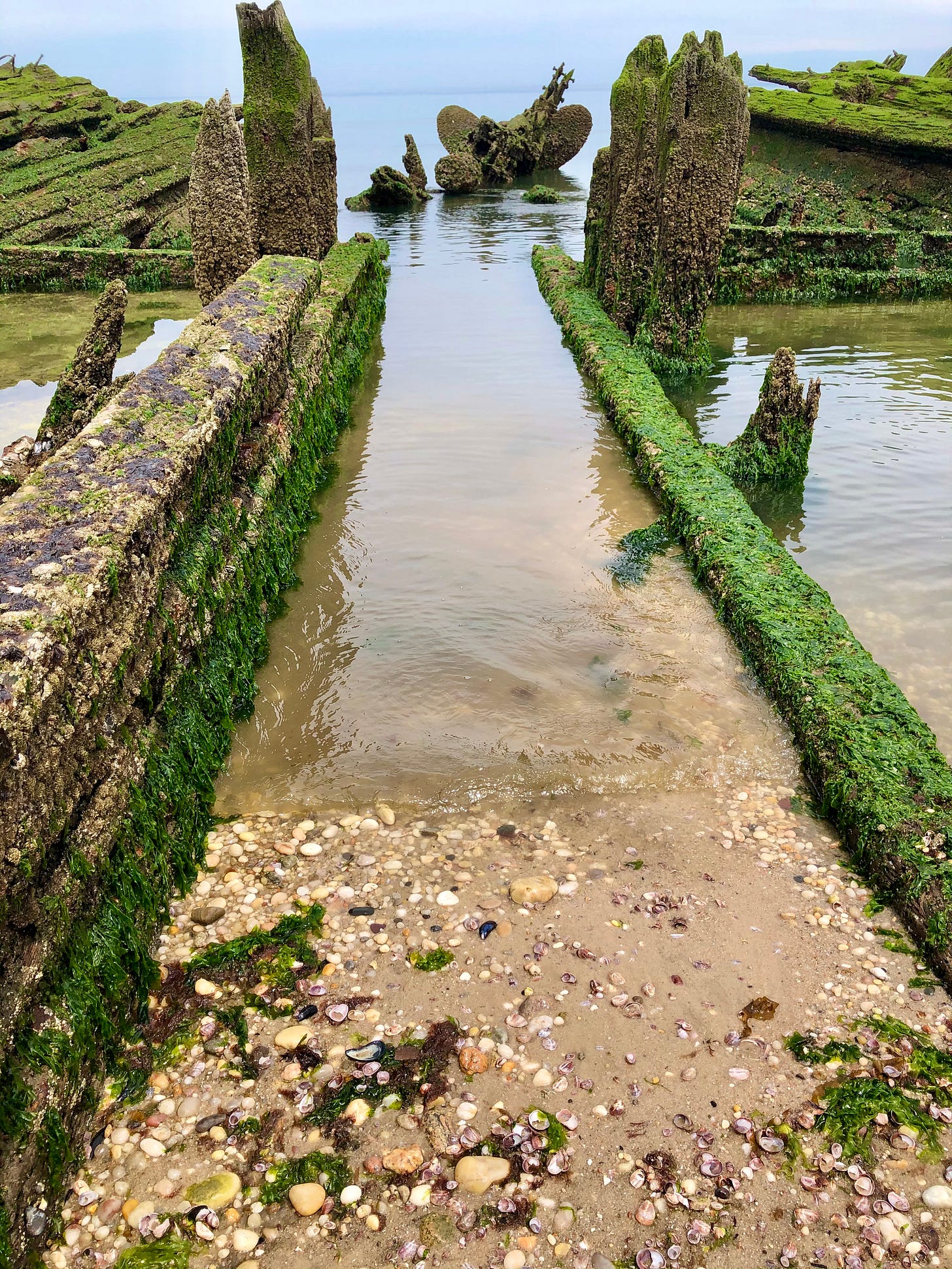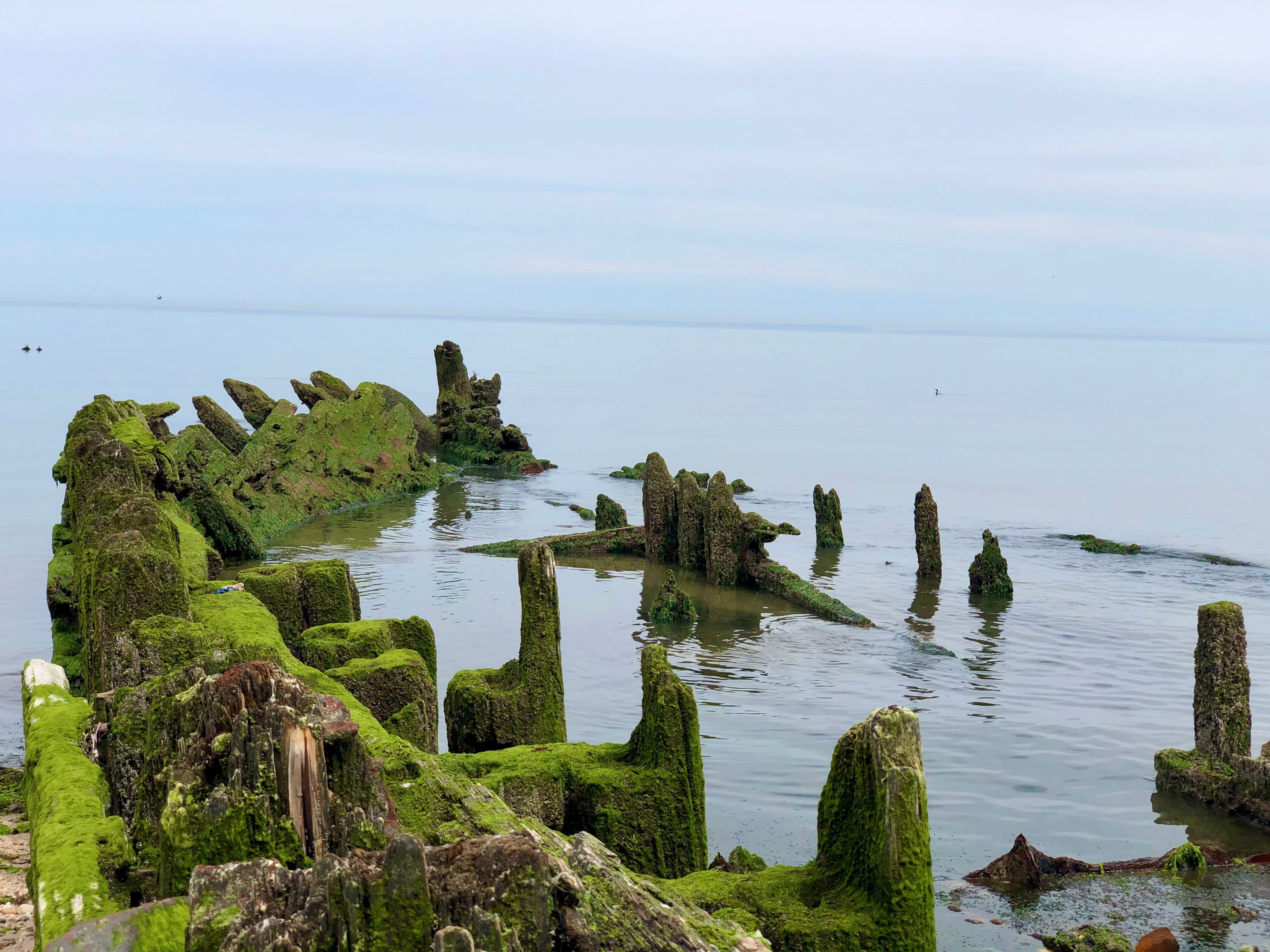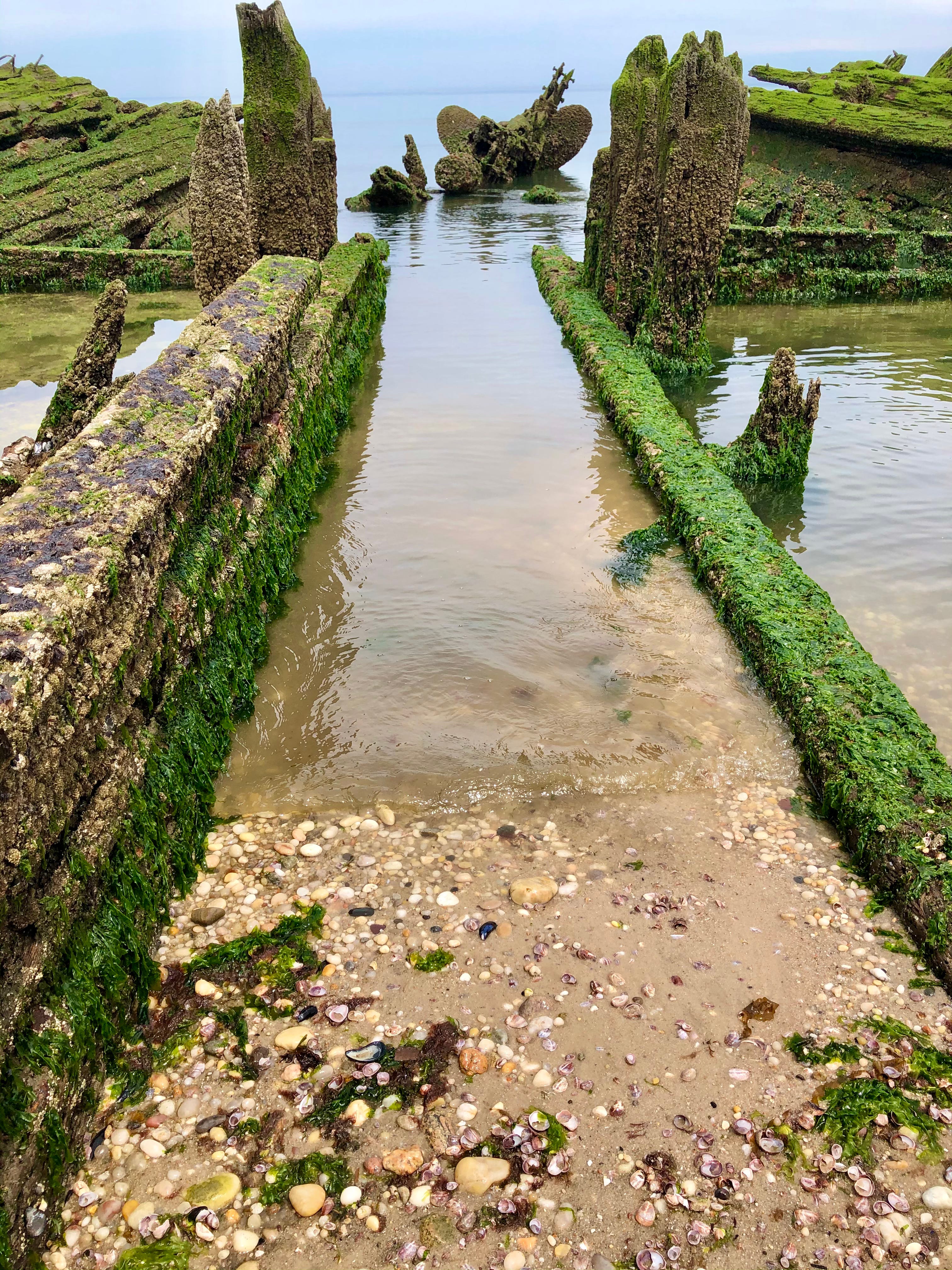 I’ve come to Reeves at low tide, hoping to see as much of the shipwrecks as I can. The wide shore is covered in seashells left by the receding waves. Bright blues, indigos, and purples of periwinkles along with empty mussel shells mix in with the green seaweed and light gold sand.