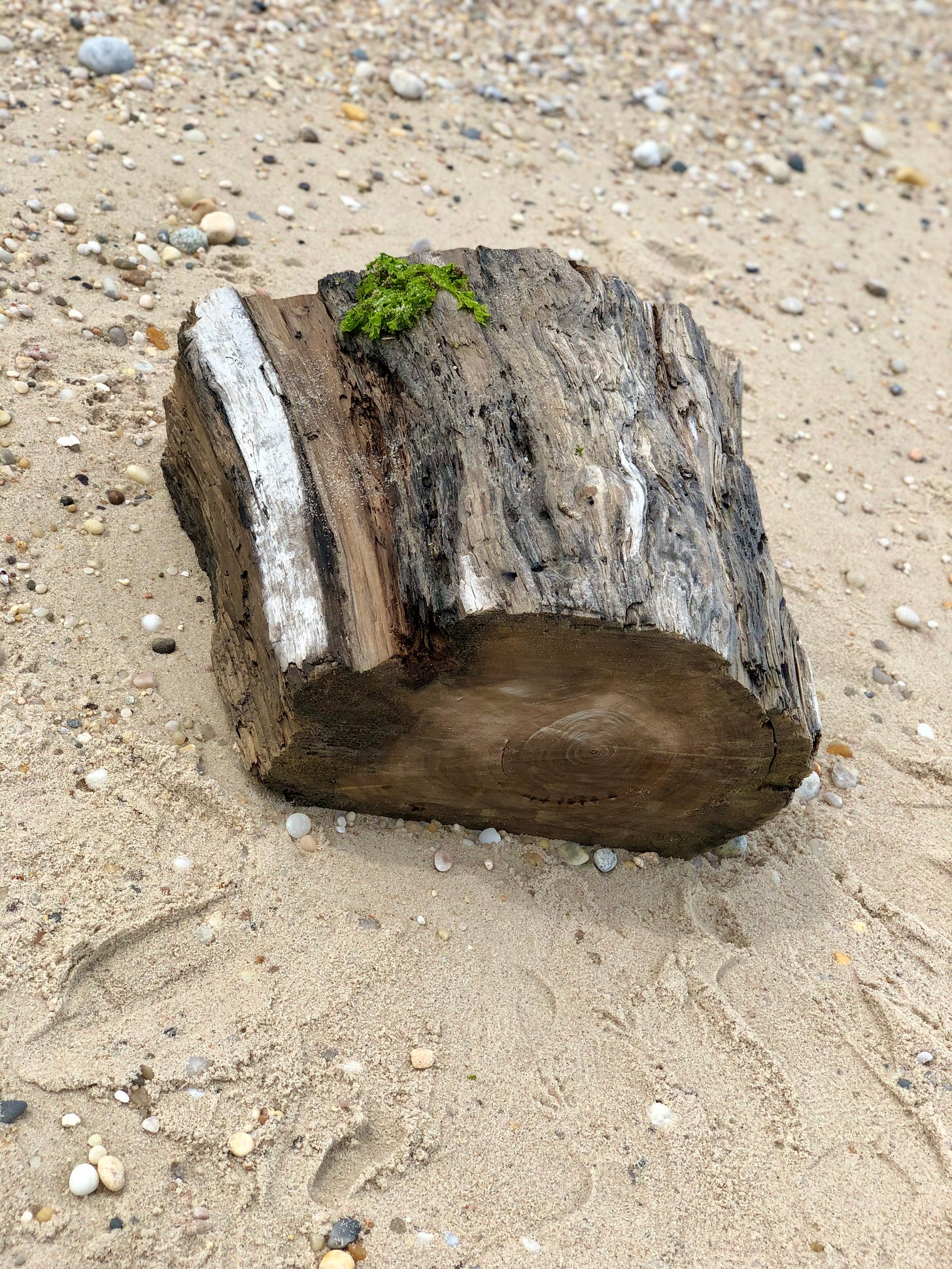 I find a cold pool within the wreckage and place my can of beer in it, giving it more time to chill. I take in the green bluffs above the shore, and the ship becoming more submerged by waves as the tide comes in. The sun feels good and warm on my wet skin. I untie my shirt from my wrist and put it back on as I walk down the beach. Ahead of me I see a shape that looks like a treasure chest, but as I come upon it I can see that it’s simply a stump, meant for sitting around a fire pit that someone has dug into the sand.